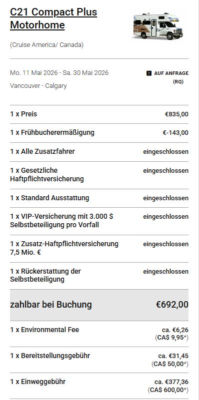 - Die Reise ist nur zusammen mit einem Wohn- oder Campmobil aus unserem Programm analog zur Wohnmobilreise buchbar.